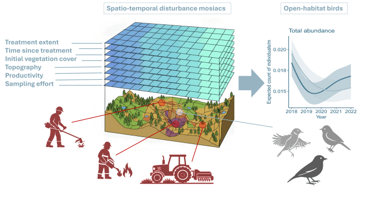 Our study documents the initial effects of mosaics (or patchworks) of cutting and burning treatments on the heathland structure and the populations of several key bird species. We found that bird populations in areas that were subjected to treatments either increased, remained more stable or, after an initial decline, recovered stronger compared to populations in similar untreated reference areas over the 5-year study period.