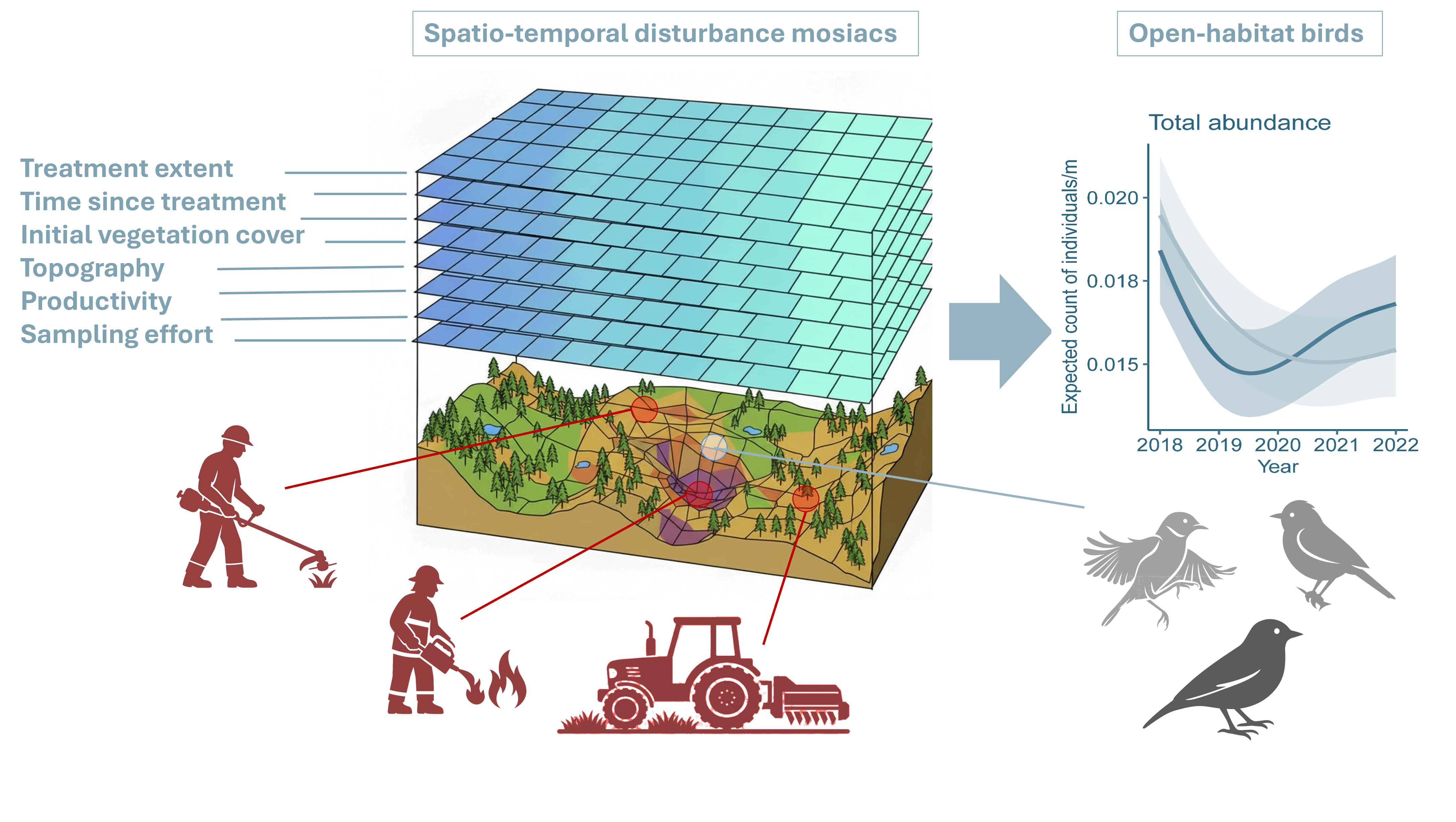 Our study documents the initial effects of mosaics (or patchworks) of cutting and burning treatments on the heathland structure and the populations of several key bird species. We found that bird populations in areas that were subjected to treatments either increased, remained more stable or, after an initial decline, recovered stronger compared to populations in similar untreated reference areas over the 5-year study period.