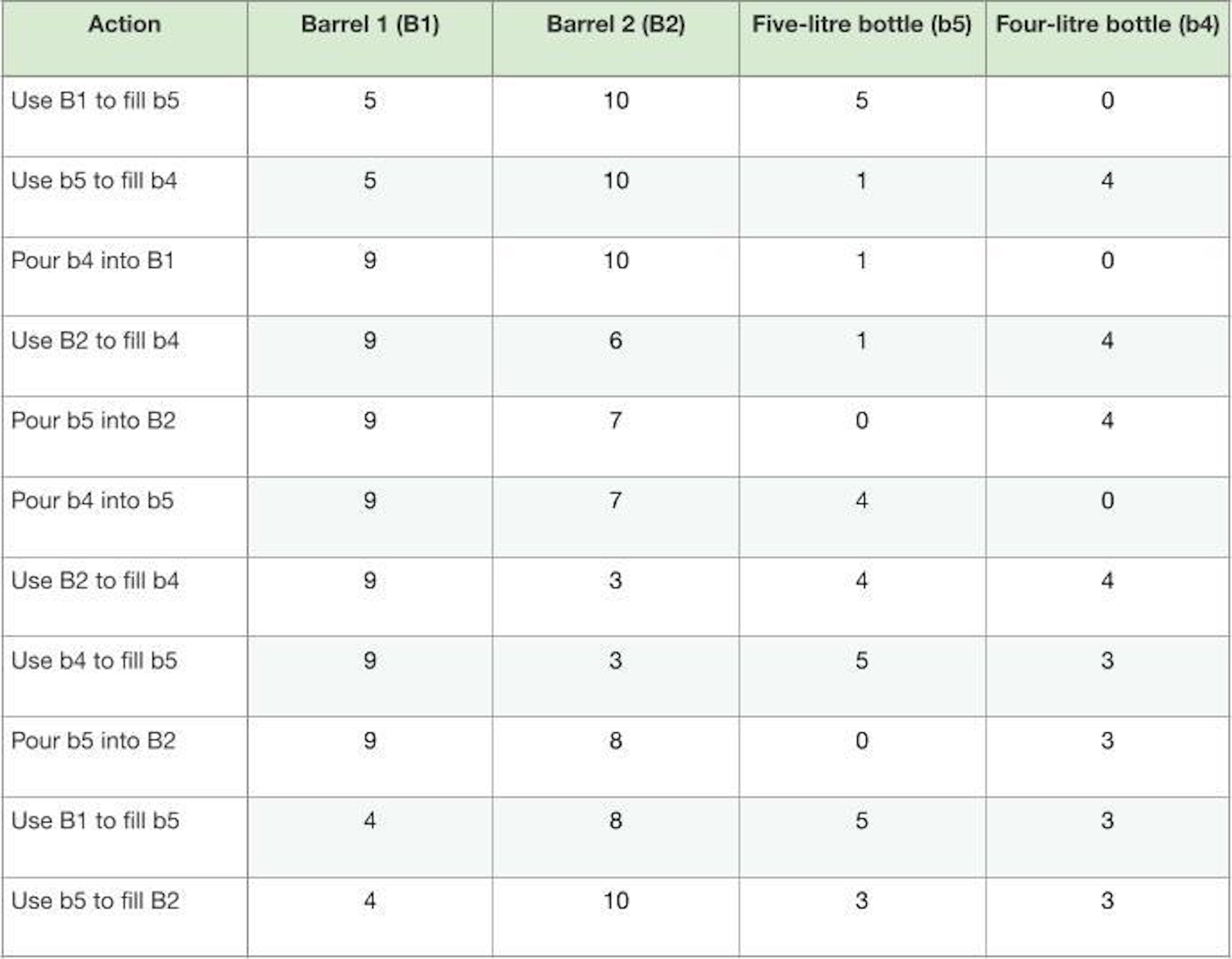 Puzzle 3: You are now entrusted with allocating the mulled wine, which is currently in two full ten-litre barrels. The chef hands you one five-litre bottle and one four-litre bottle, both empty. He orders you to fill the bottles with exactly three litres of wine each, without wasting a drop. How can you do this?