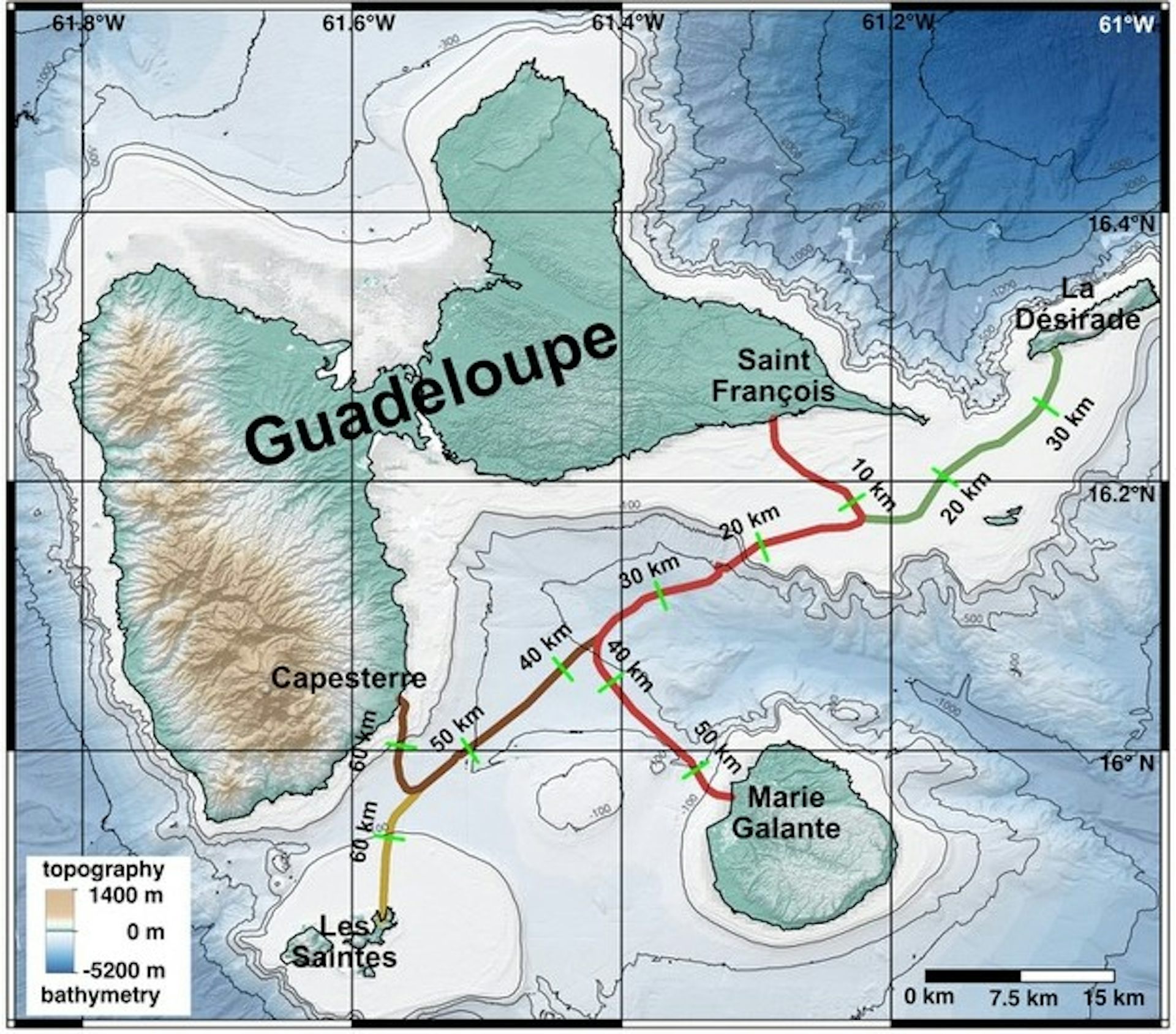 The islands of Guadeloupe are connected by undersea telecom cables, marked on this map.
