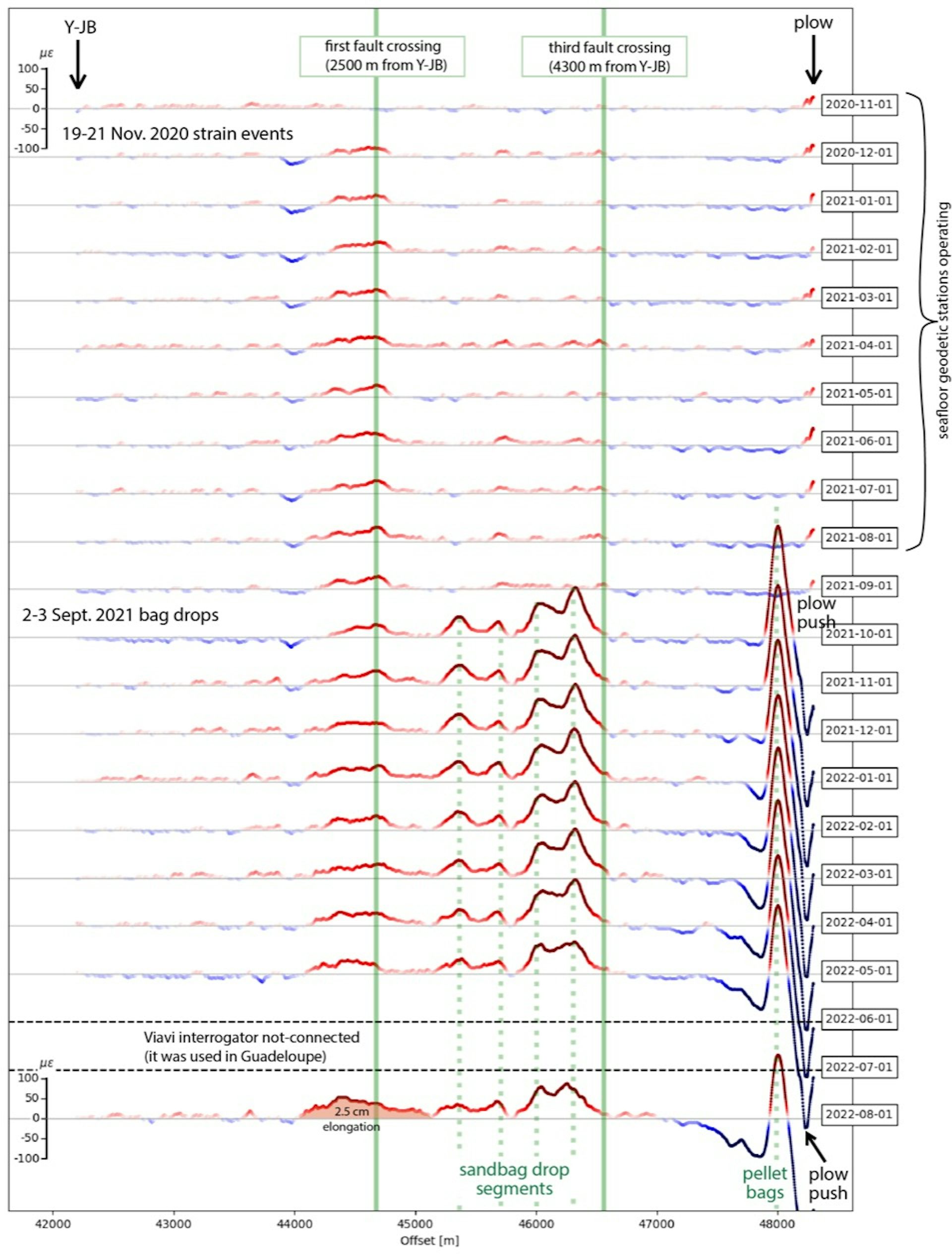 A natural disturbance in the FOCUS fibre-optic cable was detected about 1 month later, in November 2020, representing an elongation of about 1.5 cm at the first fault crossing. At first it seemed the fault might have moved, but the acoustic beacons showed no change.
