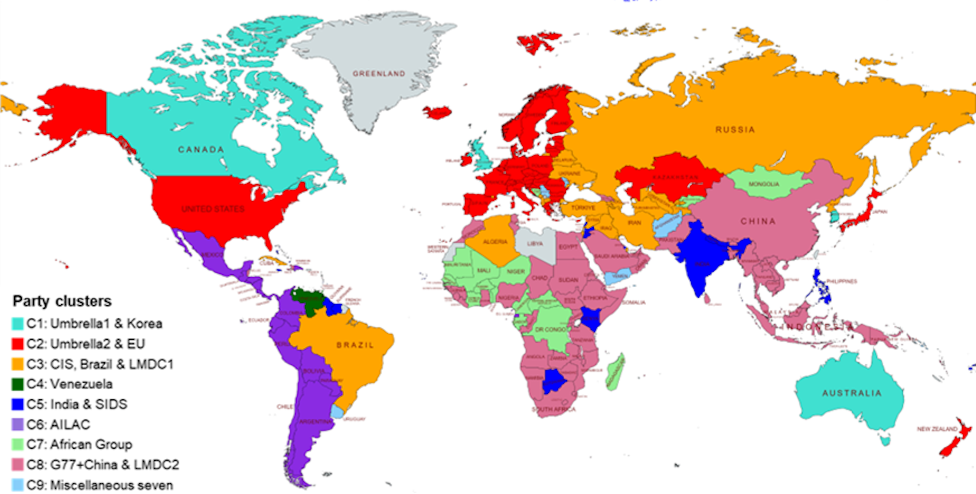 One cluster, which includes Brazil, Russia and other former Soviet states, emphasizes the implications of climate action on economic development. Meanwhile, Small Island Developing States (SIDS), which are highly vulnerable to the impacts of climate change, highlight adaptation and the need for international support.