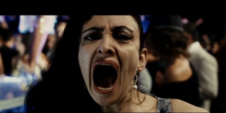 The transition to the second sequence, that of the nightclub, is a guest’s hysterical scream filmed in close-up. It acts as a cry of distress to express the transition from strong but bygone ideologies to the ideology of seemingly carefree, narcissistic enjoyment.
