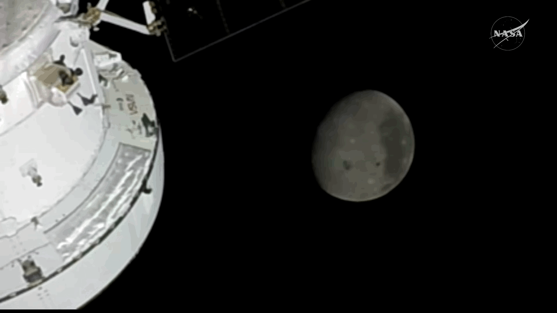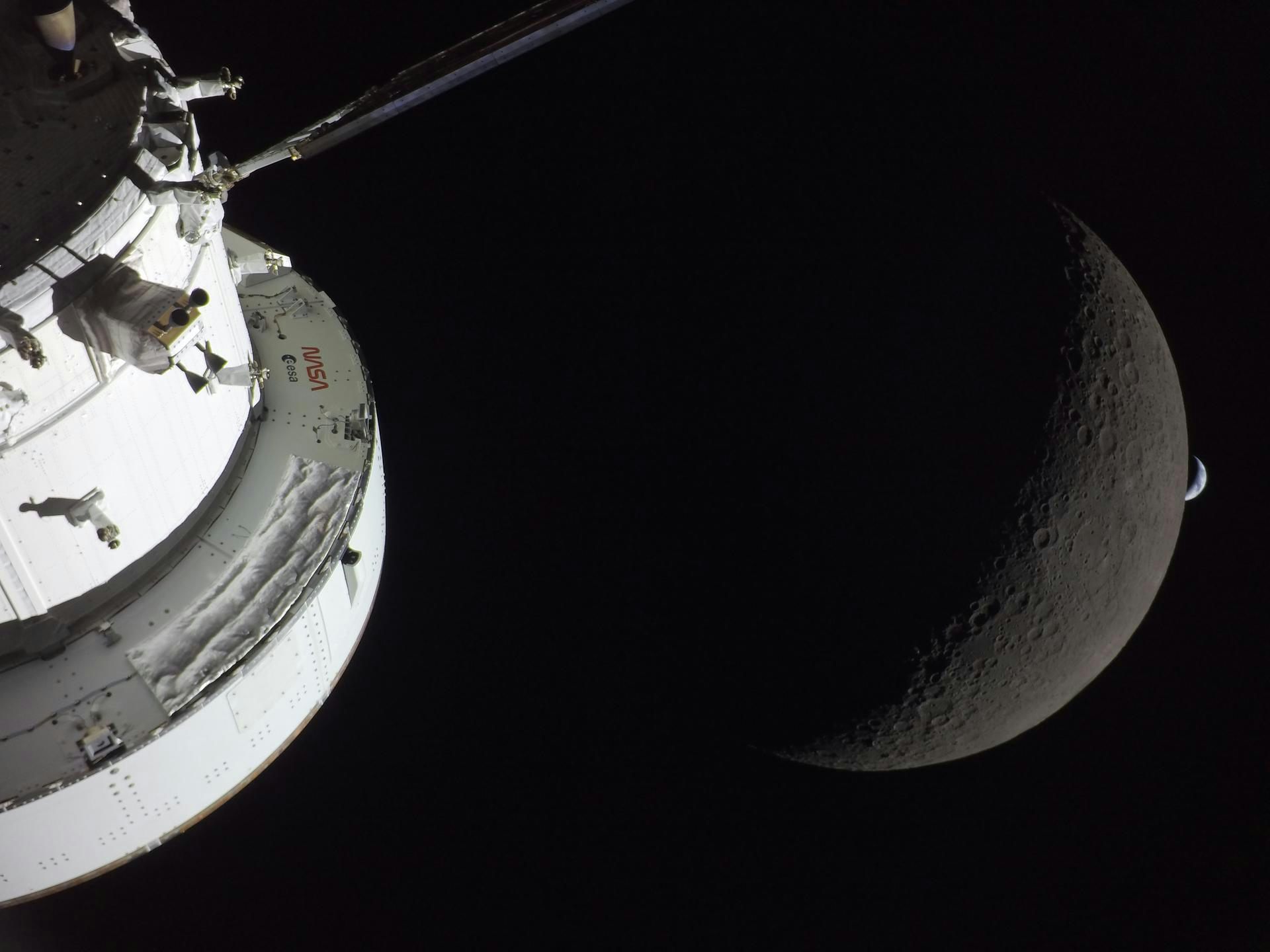 Earth, the Moon and Artemis II, taken from a camera on one of the solar panels as the Earth passed behind the limb of the Moon – shortly before the loss of signal.