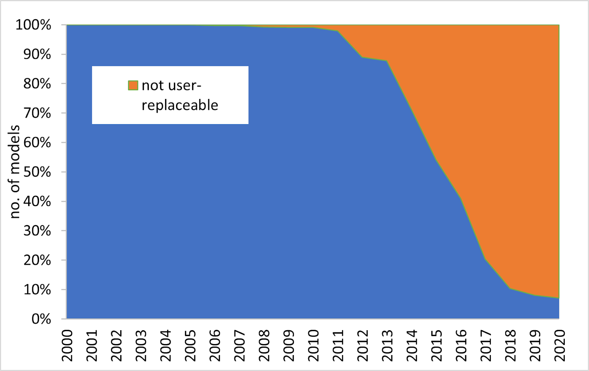 The share of mobile phones with user-replaceable batteries, 2000-2020