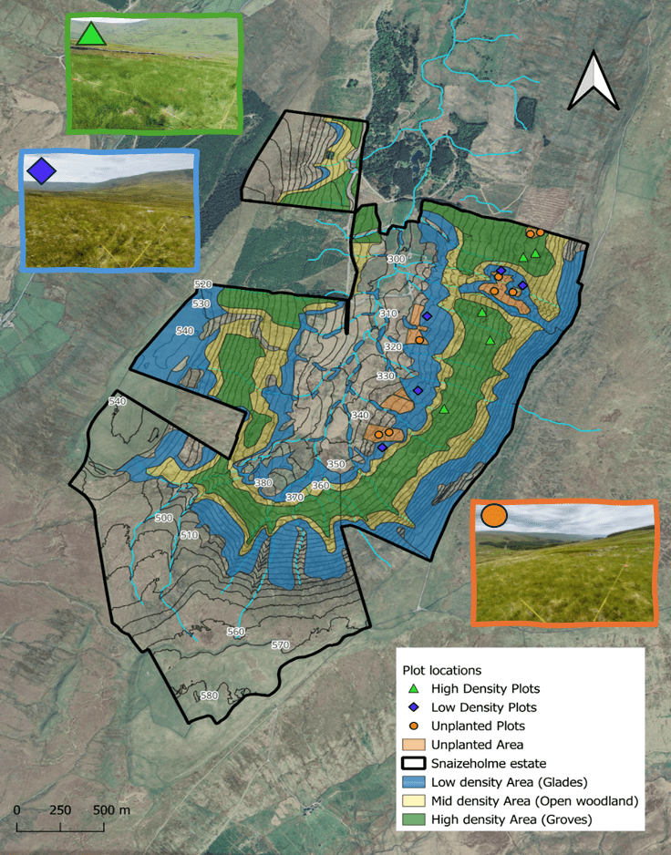 Figure 1: Site map of Snaizeholme with photo insets showing examples of 10 x 10 m plots in each of the tree planting areas. The location of plots within the tree planting areas of different densities is indicated. Contour labels indicate elevation in meters above ordnance datum (AOD). Figure 1 is an adapted version of figure from recently published research article