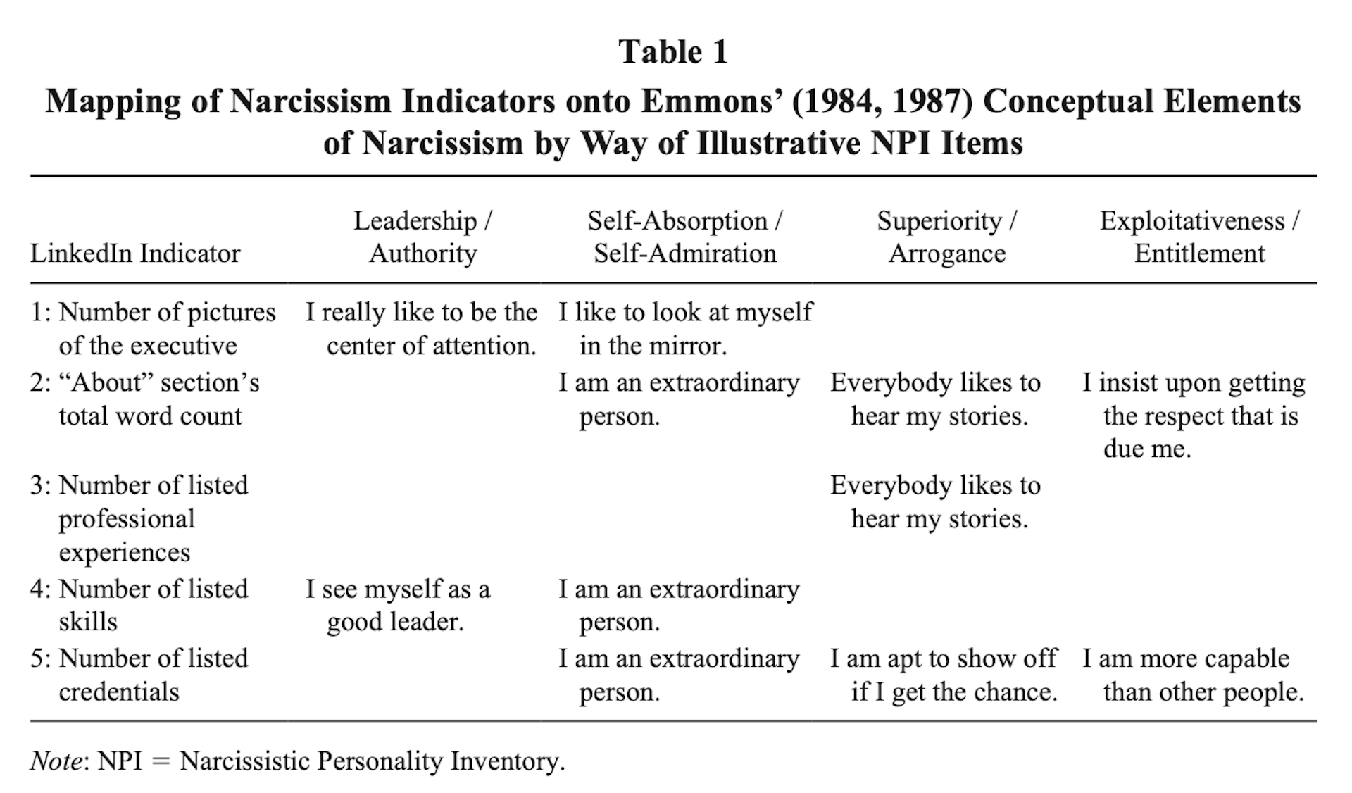 Admittedly, research that only uses social media profiles may focus on the most narcissistic managers, since less narcissistic executives may not maintain, for example, a LinkedIn presence. Moreover, social psychology research suggests that social media itself encourages exaggeratedly narcissistic communication by encouraging self-promotion. To help address these concerns, Junge et al. assigned managers without LinkedIn profiles the lowest possible narcissism score and included them in their overall analysis. Their study found strong correlations between the LinkedIn-based measure and earlier, unobtrusive measures of narcissistic CEO behavior, as well as traditional psychometric tests such as the NPI.
