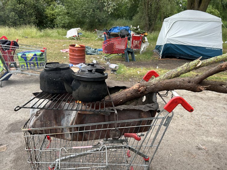 In a supermarket trolley, which they normally use to transport belongings, the shop owners set up a wood fire and two large black cast-iron kettles and heat the water for the coffee on a blackened grate. The pungent smell from the fire is due to the hydro-alcoholic gel and plastic crates they use for fuel. They ask if we want to join them for a coffee.