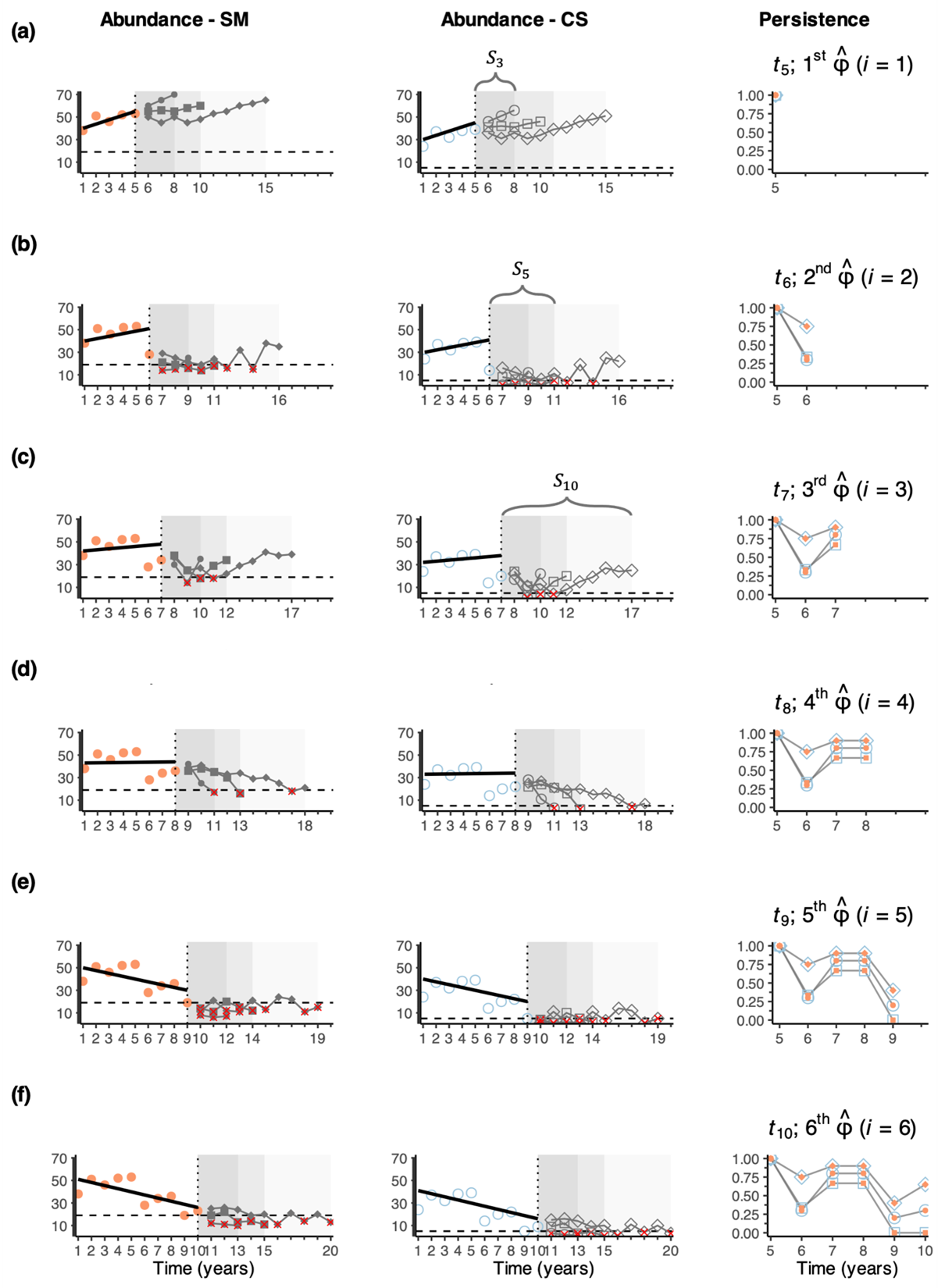 En lugar de utilizar una única evaluación de la tendencia de la probabilidad de extinción, que podría definirse como la disminución de las poblaciones por debajo de un umbral de conservación (cuasi-extinción), algunos investigadores han propuesto evaluar esta probabilidad simultáneamente con el monitoreo. Con este enfoque, se actualiza la dinámica de la población y, mediante simulaciones de trayectorias a un futuro cercano, los investigadores pueden evaluar los cambios temporales en la probabilidad de (cuasi) extinción o su inverso, la persistencia poblacional. La probabilidad de persistencia es especialmente útil cuando las poblaciones se desplazan por áreas extensas y, por lo tanto, las “extinciones” locales pueden simplemente reflejar el movimiento fuera del área de estudio.