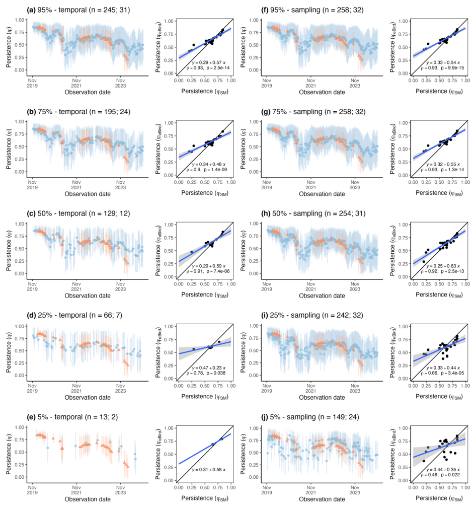 Nuestros resultados mostraron tendencias notablemente similares en la probabilidad de persistencia al usar los dos conjuntos de datos, incluso con la reducción de los datos de eBird en un alcance temporal (semanas) o de muestreo (listas). Al comparar las estimaciones de probabilidad de persistencia utilizando eBird y datos de monitoreo estandarizados, identificamos una oportunidad para aprovechar la creciente disponibilidad de datos de ciencia comunitaria para monitorear las tendencias poblacionales y evaluar el riesgo de extinción. Si bien es útil para rastrear las tendencias poblacionales y pronosticar el riesgo de extinción a corto plazo, nuestro enfoque no reemplaza los proyectos de monitoreo estandarizado a largo plazo para la conservación de poblaciones.