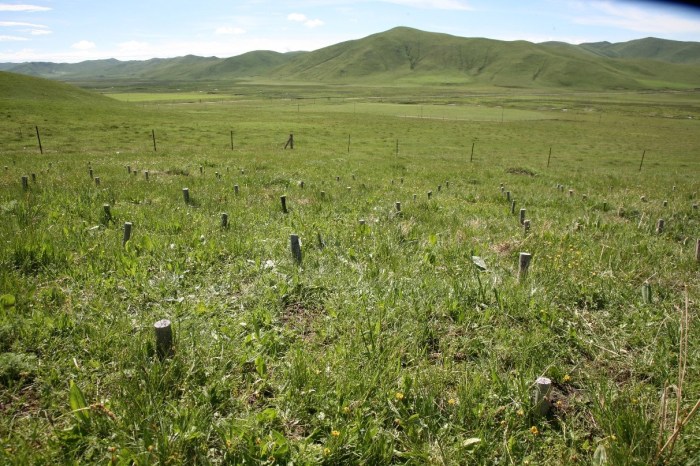 Experimental plots of plant species removal in an alpine meadow on the Tibetan Plateau. (Credit: Kechang Niu)