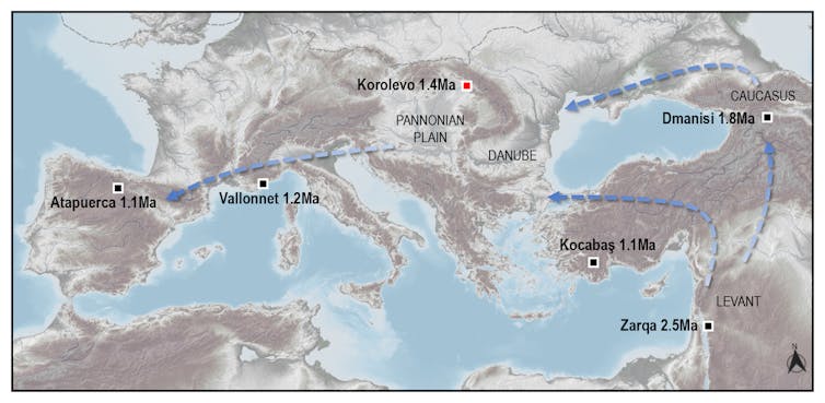Once into Eurasia, people migrated eastward at a remarkable pace, reaching as far as the island of Java, southeast Asia, by around the same time we find them in western Ukraine. It is not known what caused the delayed westward incursion into Europe, but it appears that Korolevo bridges the migration gap between the Caucasus (1.8 million years ago) and sites in southwestern Europe dated to 1.2 to 1.1 million years at Atapuerca and Vallonnet. One proposal is that people entered Europe from the east via the Danube Valley and Pannonian Plain.