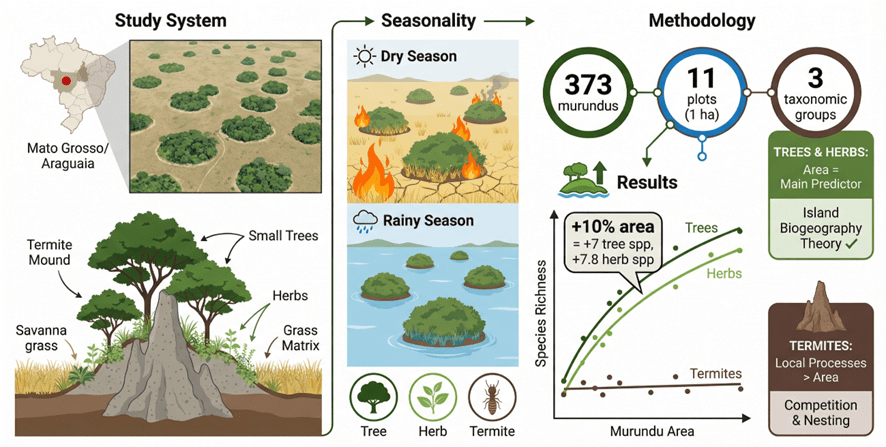 Many landscapes contain “island-like” habitats: patches of suitable conditions surrounded by an inhospitable matrix. How species diversity is regulated in these systems remains surprisingly poorly understood. In tropical savannas, such as the Cerrado of central Brazil, one striking example is the campos de murundus (literally “fields of earth mounds”). These landscapes are dotted with thousands of small earth mounds built and maintained by termites. During the rainy season, the surrounding grasslands are flooded, while the mounds remain dry, functioning as true islands for plants and animals that cannot tolerate waterlogged soils. This natural mosaic offers an exceptional opportunity to test whether classic island biogeography concepts, habitat availability, or landscape-scale processes best explain patterns of biodiversity.