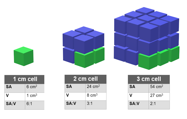 All living things must also contend with a universal physical constraint noted by Galileo Galilei. Bigger cells tend to have less surface area per unit of volume. This means that the natural movement (diffusion) of molecules of gases, nutrients and wastes in an out of the cell isn’t enough to keep things running without a transport system. These molecules also have further to travel in larger cells.