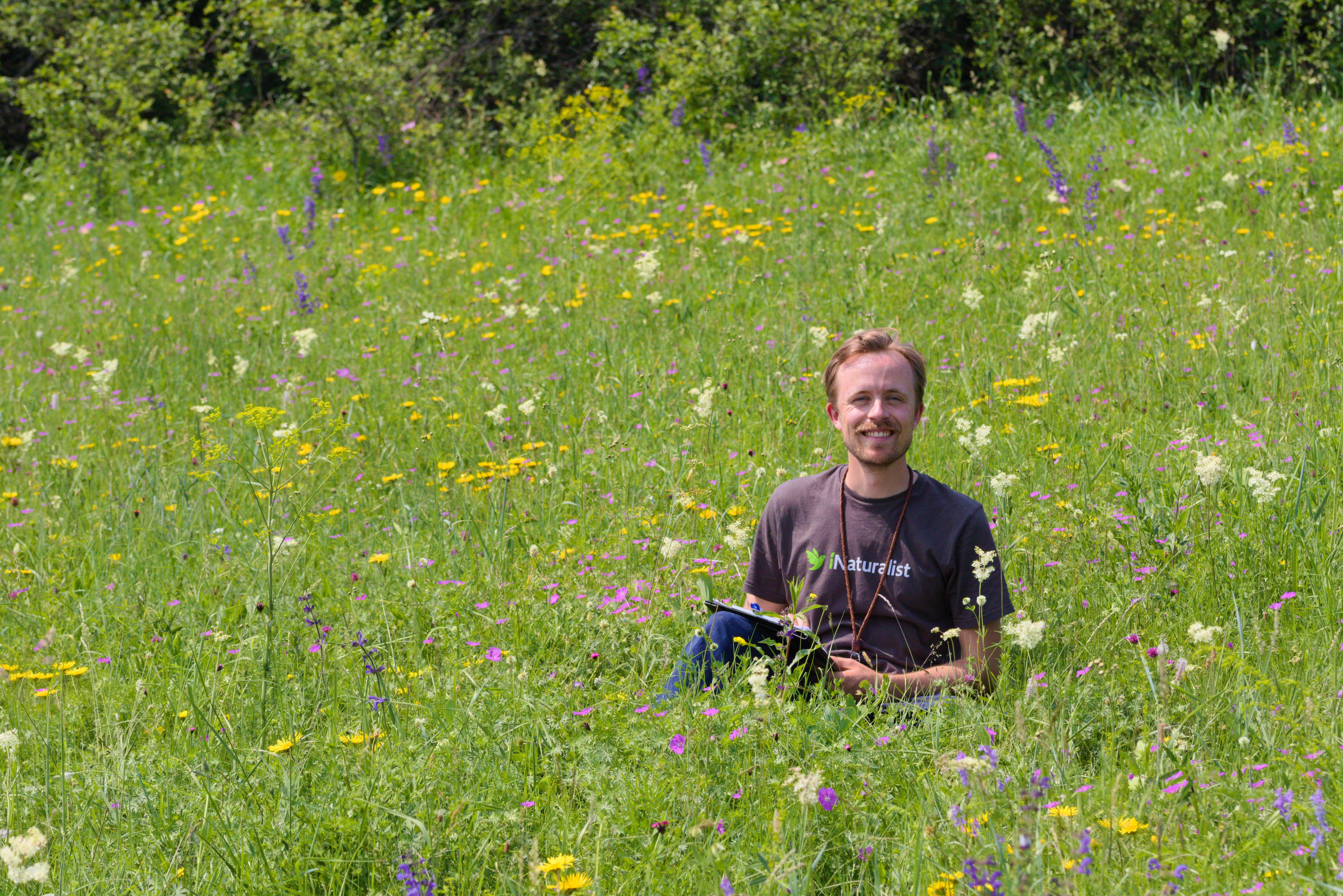 Skjold sitting in extremely rich, old-growth grassland vegetation in Transylvania © Skjold Alsted Søndergaard
